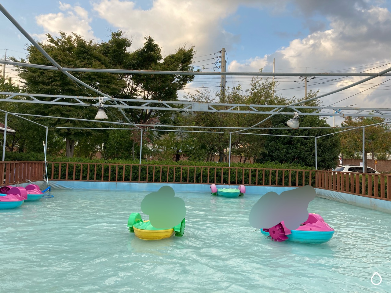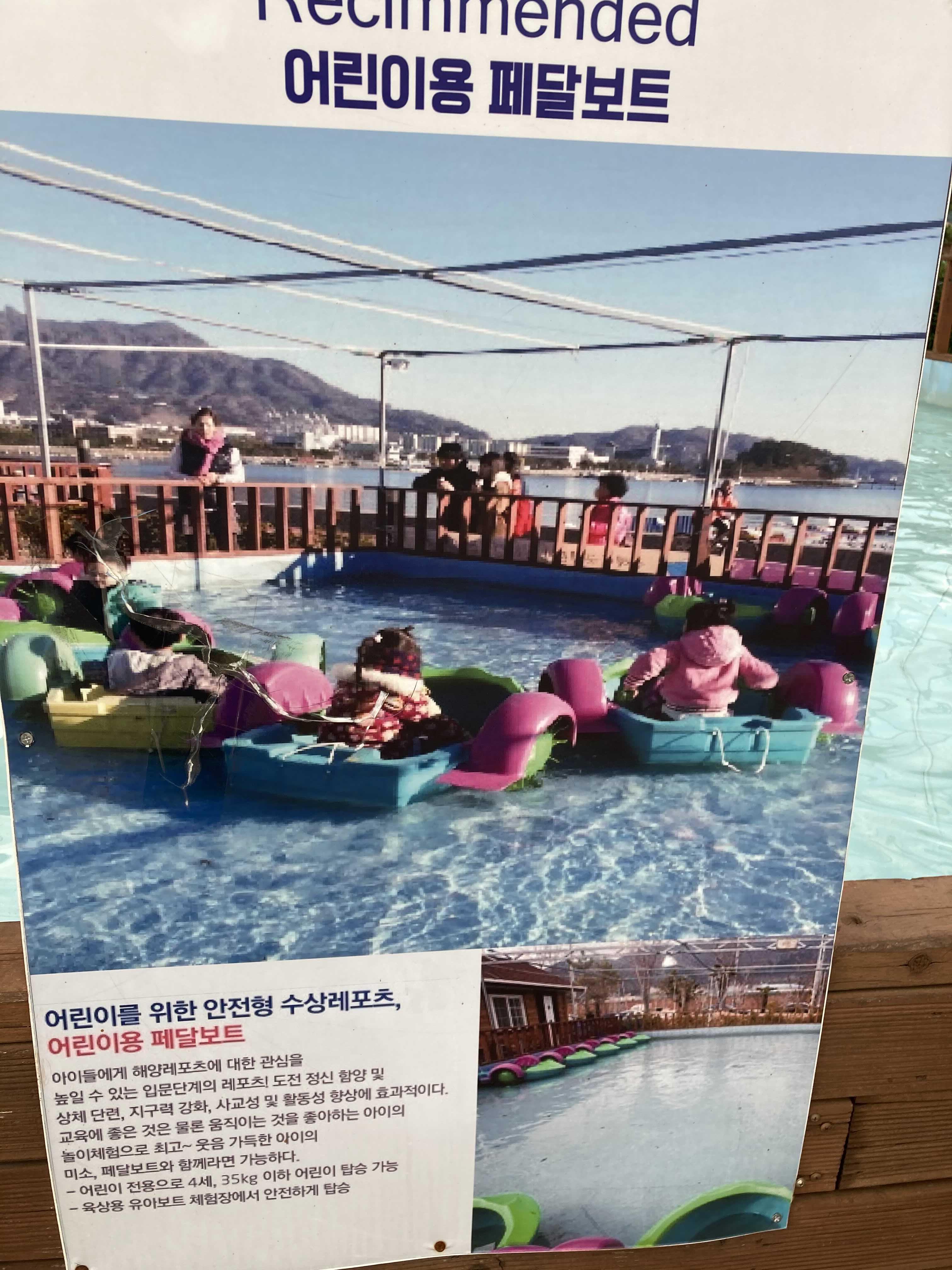 20킬로 이하의 어린이라면 누구나 탑승가능한데 성인 무릎보다 조금 얕은 풀장에서 미니보트를 타고 손으로 페달을 저어서 방향전환을 하며 노는 거다. 부모가 비치되어 있는 장화를 신고 들어가서 옆에서 대신 밀어줄 수도 있기 때문에 어린 유아들도 즐길 수 있었다.