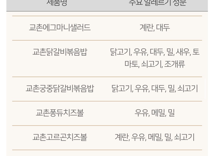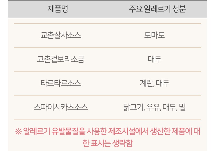 치킨은 알러지 정보가 제공되지 않는 치킨 브랜드가 너무나 많은데 무슨 재료가 얼마나 들어가는지 알 수가 없으니 먹일 수가 없다. 그러나 치킨 중에도 세심하게 알러지 정보를 표기하고 있는 브랜드가 있었는데 바로 교촌치킨:::