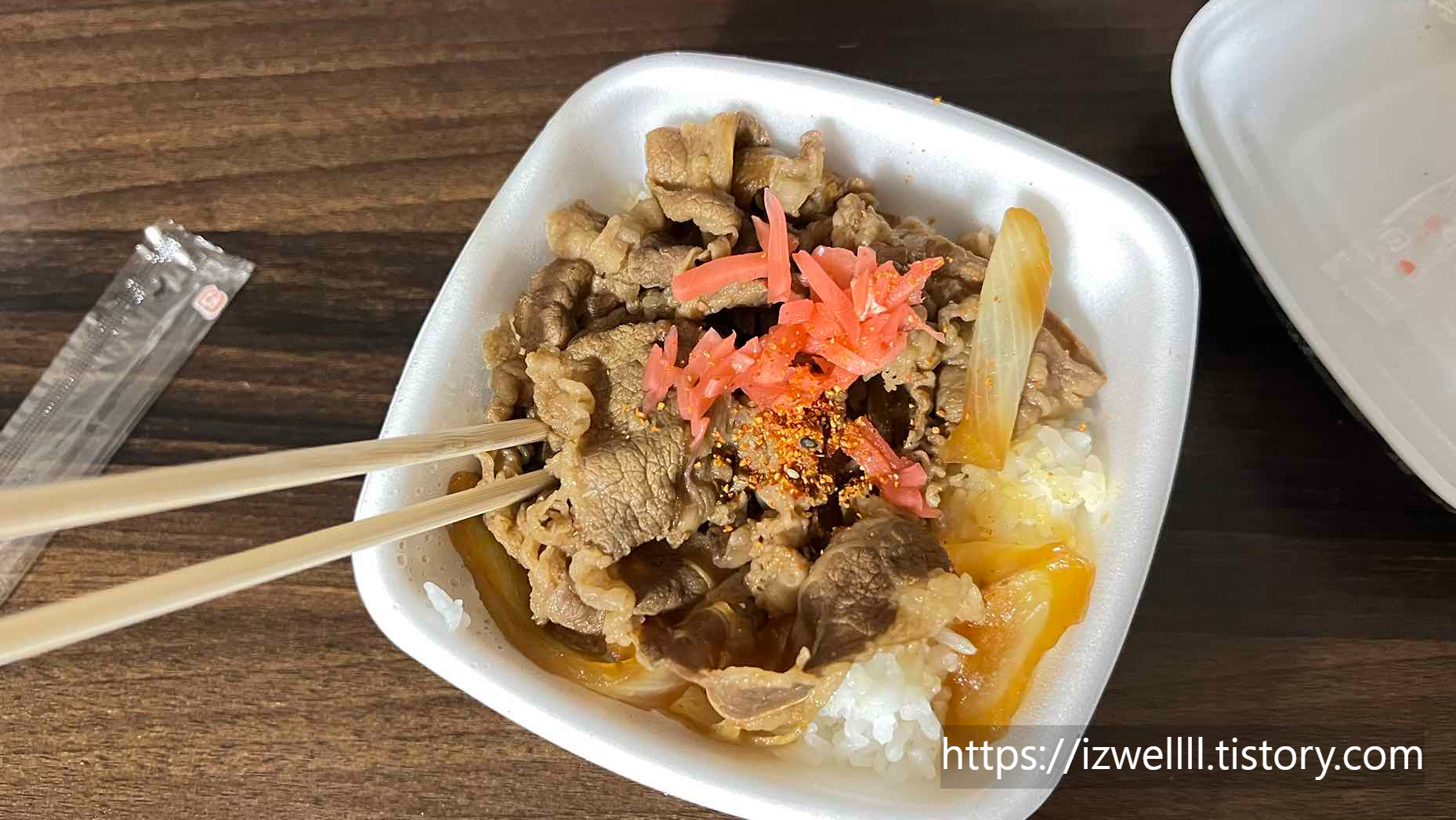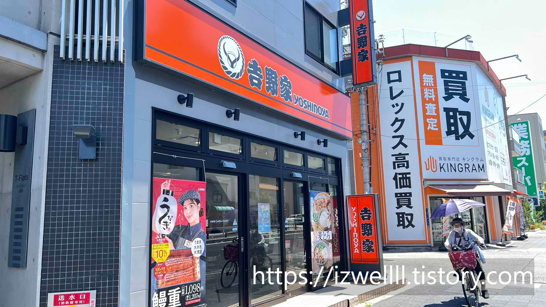 '규동'은 일본 메이지시대부터 내려온 대표적인 서민 음식 중 하나인데요. 아래 사진에서 보이는 매장은 '요시노야'라는 규동집입니다. 일본의 3대 규동 체인점 중 하나라 할 수 있습니다. 일본 내에서는 한국의 김밥천국 같은 체인점이라 생각하시면 되는데 매장을 가보면 혼밥러들이 주로 이용하는 모습을 볼 수 있고 24시간 운영하는 매장이 많아 야간에도 심심찮게 손님을 볼 수 있기도 합니다. 요시노야 좋아하는 우리 부부는 덕분에 아이들 재워두고 밤늦게라도 근처에 매장이 있으면 언제든지 요시노야를 열심히 사다 날랐습니다🥡🥡