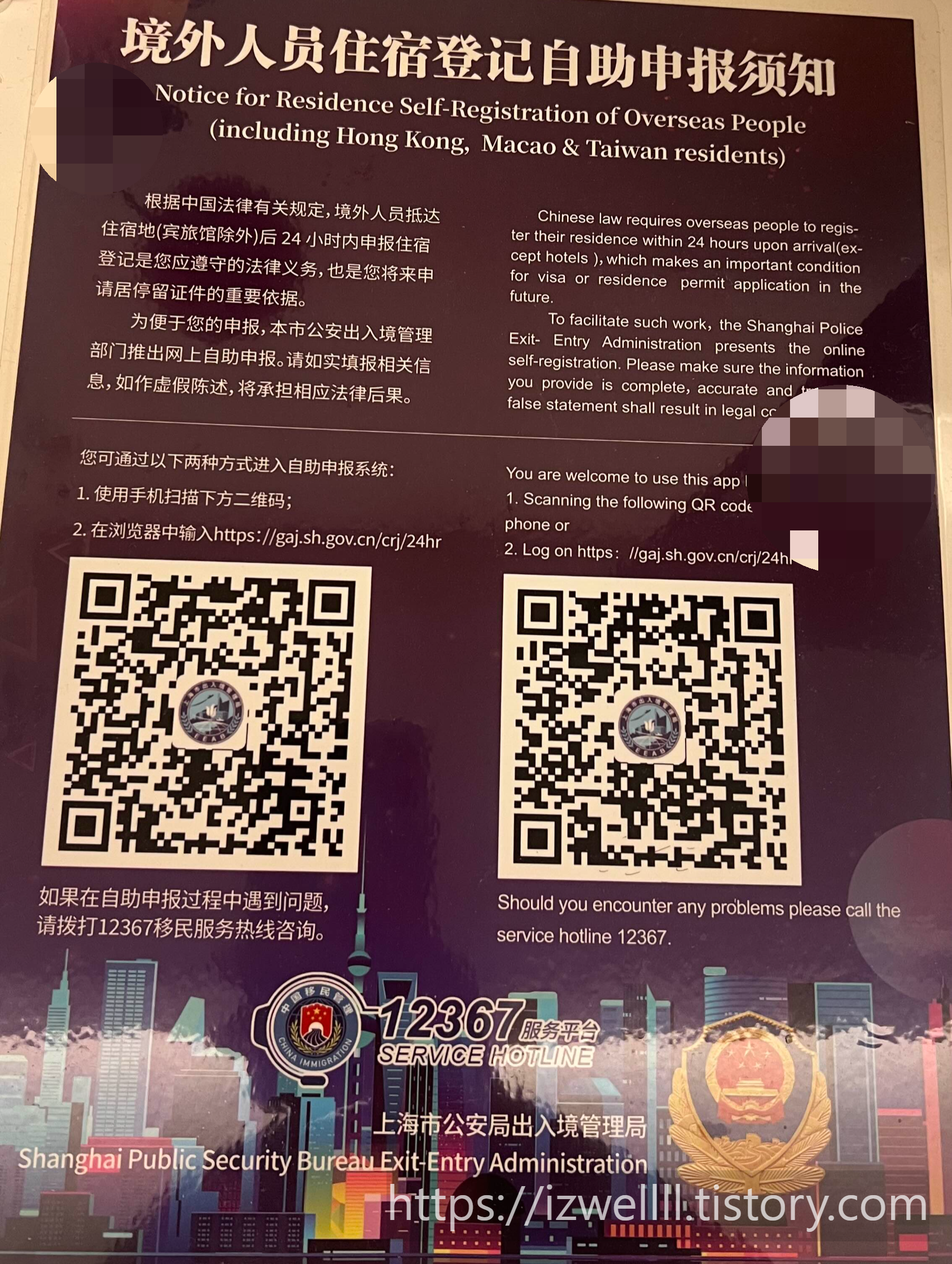 저도 최근에 상하이 여행 다녀오면서 아파트먼트에 머물게 되었는데 상하이로 출국하기 하루 전날 밤 위 큐알 통해서 온라인 주숙등기를 마치고 갔습니다.